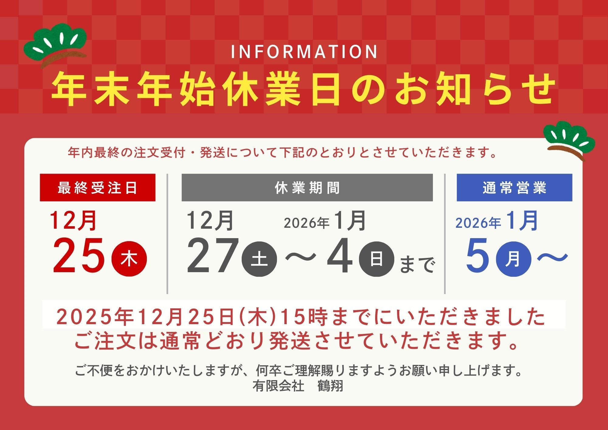 休業期間中のご注文、お問い合わせは休業明けの1月5日より順次対応させていただきます。